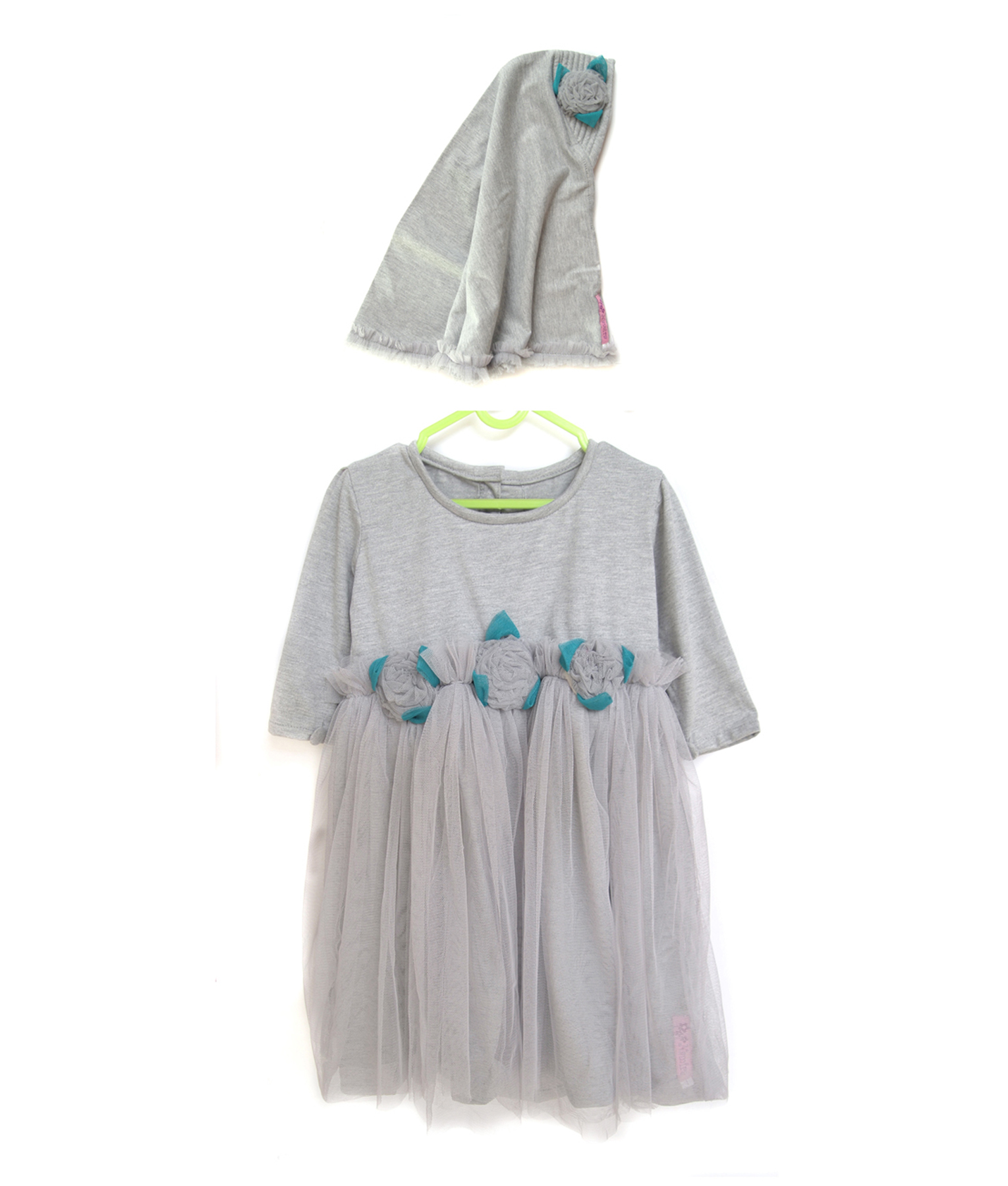 Baju gamis muslim warna abu-abu dalam bentuk dress bahan kaos yang dipercantik dengan tulle tutu dengan hiasan bunga besar pada bagian pinggang, dilengkapi dengan kerudung dengan hiasan bunga yang serasi. Standard cutting.