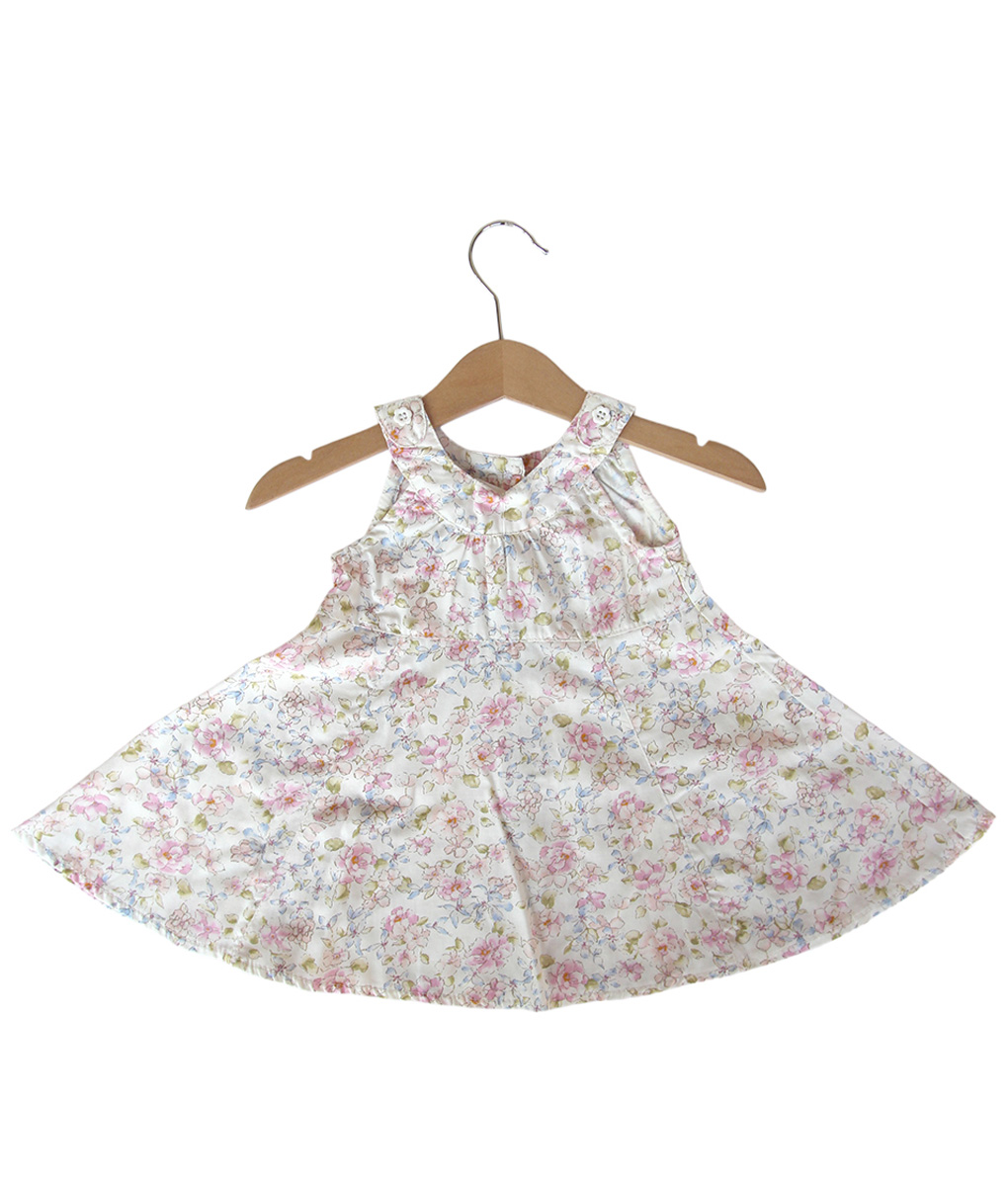 Dress putih dengan motif bunga-bunga pink-biru, dengan aksen kancing bunga pada tali bahu bermodel V-Neck. Dress manis ini cocok dikenakan untuk kegiatan sehari-hari atau saat berjalan-jalan ke taman.