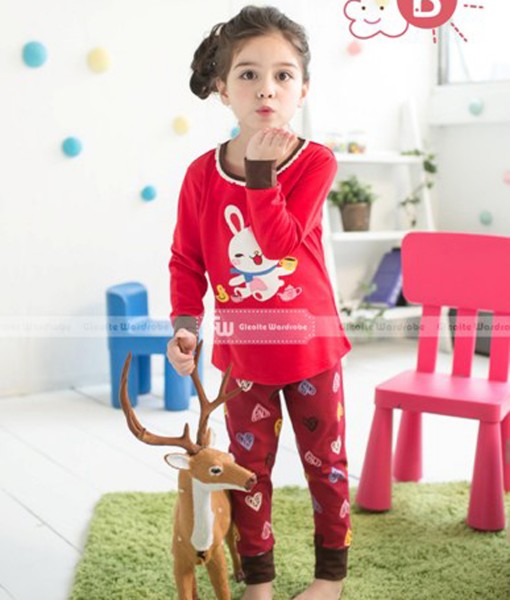 Piyama dengan atasan kaos lengan panjang dan celana panjang dilengkapi manset elastis yang serasi pada bagian lengan dan kaki, warna merah, kaos dengan bordir kelinci yang sedang minum teh, celana dengan gambar yang serasi. Kaos standard cutting, celana long cutting.