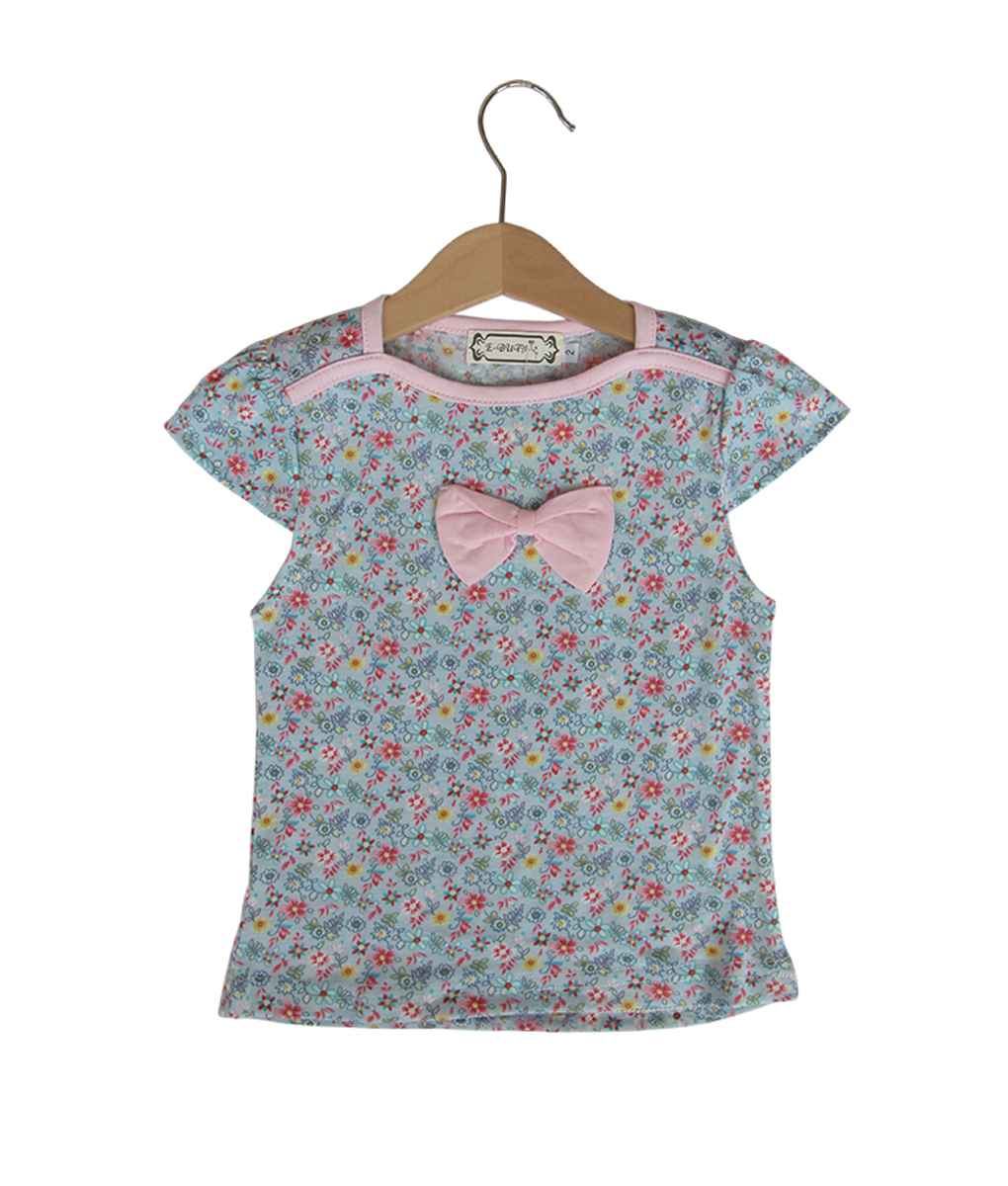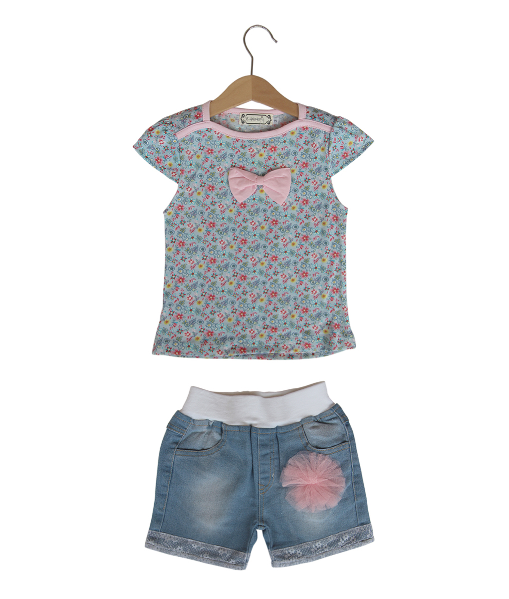 Setelan anak perempuan yang terdiri dari atasan dan celana pendek. Atasan warna kebiruan motif bunga-bunga kecil dengan model kerah kotak lining pink dan hiasan pita pink, celana pendek dengan aksen lipat pada bagian bawah dihiasi korsase pink.