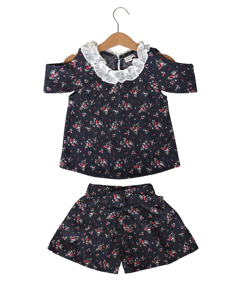 Setelan anak yang terdiri dari atasan dan celana pendek. Atasan hitam motif bunga-bunga, dengan aksen renda pada leher dan bermodel cut out shoulder. Untuk bawahannya bermodel celana dengan motif sendada dengan pita dibagian lingkar pinggang, berpinggang karet sehingga tetap nyaman dikenakan. Standard cutting.