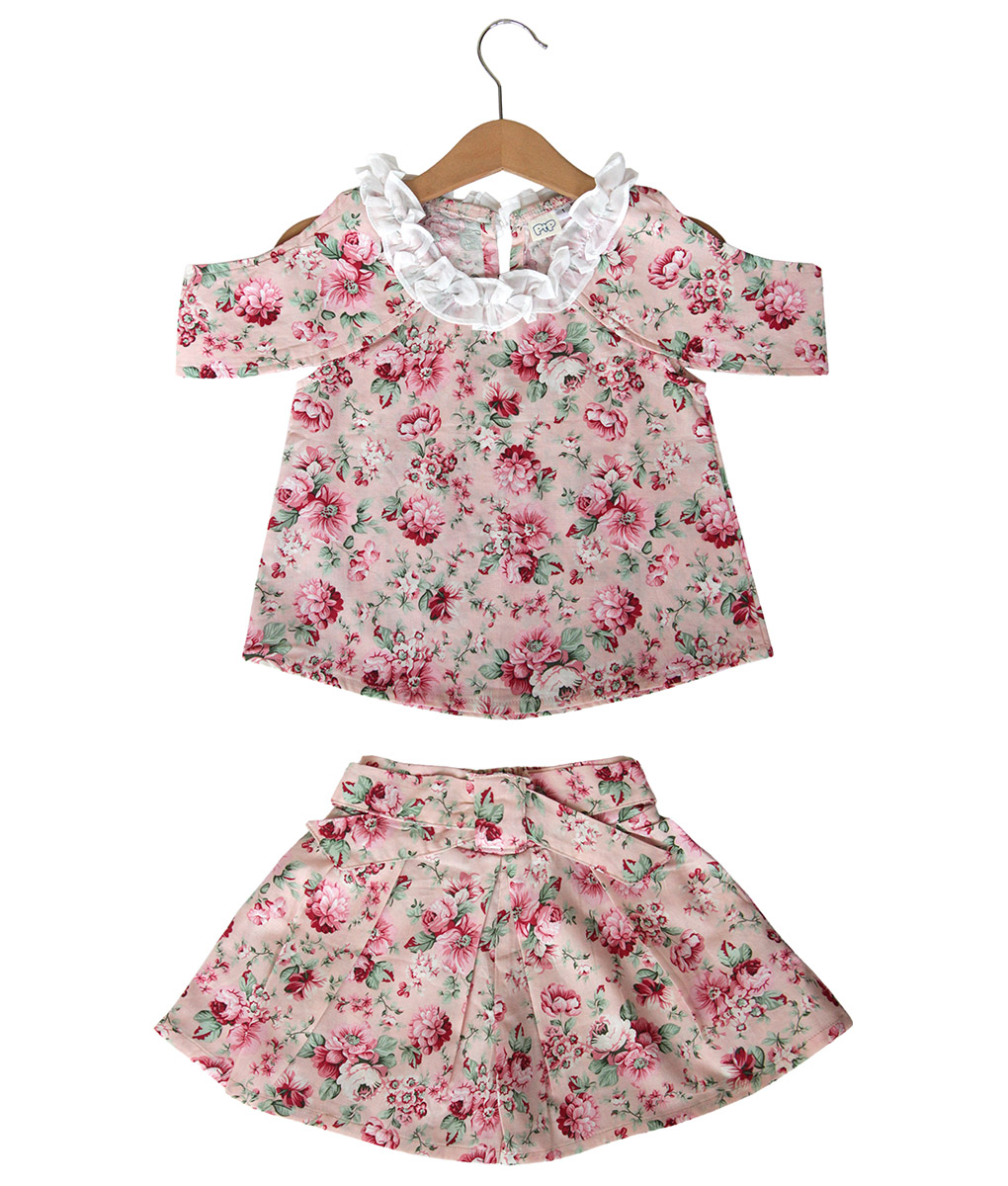 Setelan anak yang terdiri dari atasan dan celana pendek. Atasan peach motif bunga-bunga, dengan aksen renda pada leher dan bermodel cut out shoulder. Untuk bawahannya bermodel celana dengan motif sendada dengan pita dibagian lingkar pinggang, berpinggang karet sehingga tetap nyaman dikenakan. Standard cutting.