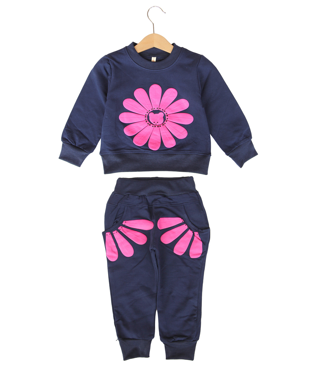 Setelan sweater dan celana panjang balita umur 12 bulan hingga 3 tahun, gambar kelopak bunga warna pink pada bagian dada dan kantong celana, dengan aksen manset elastis pada pergelangan tangan dan kaki, warna biru tua.