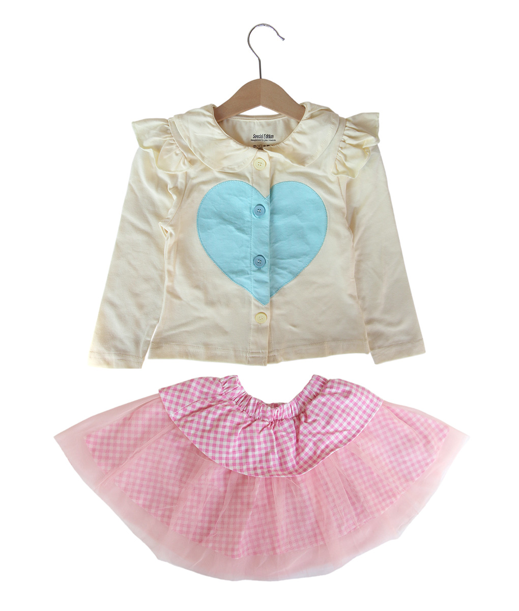 Setelan cantik untuk anak size 1-7 Tahun yang cocok untuk digunakan untuk beraktivitas, terdiri atas atasan dan rok, atasan warna kuning lengan panjang bukaan kancing depan dengan aksen ruffle di bagian bahu gambar hati, rok pendek motif kotak-kotak dengan layer.
