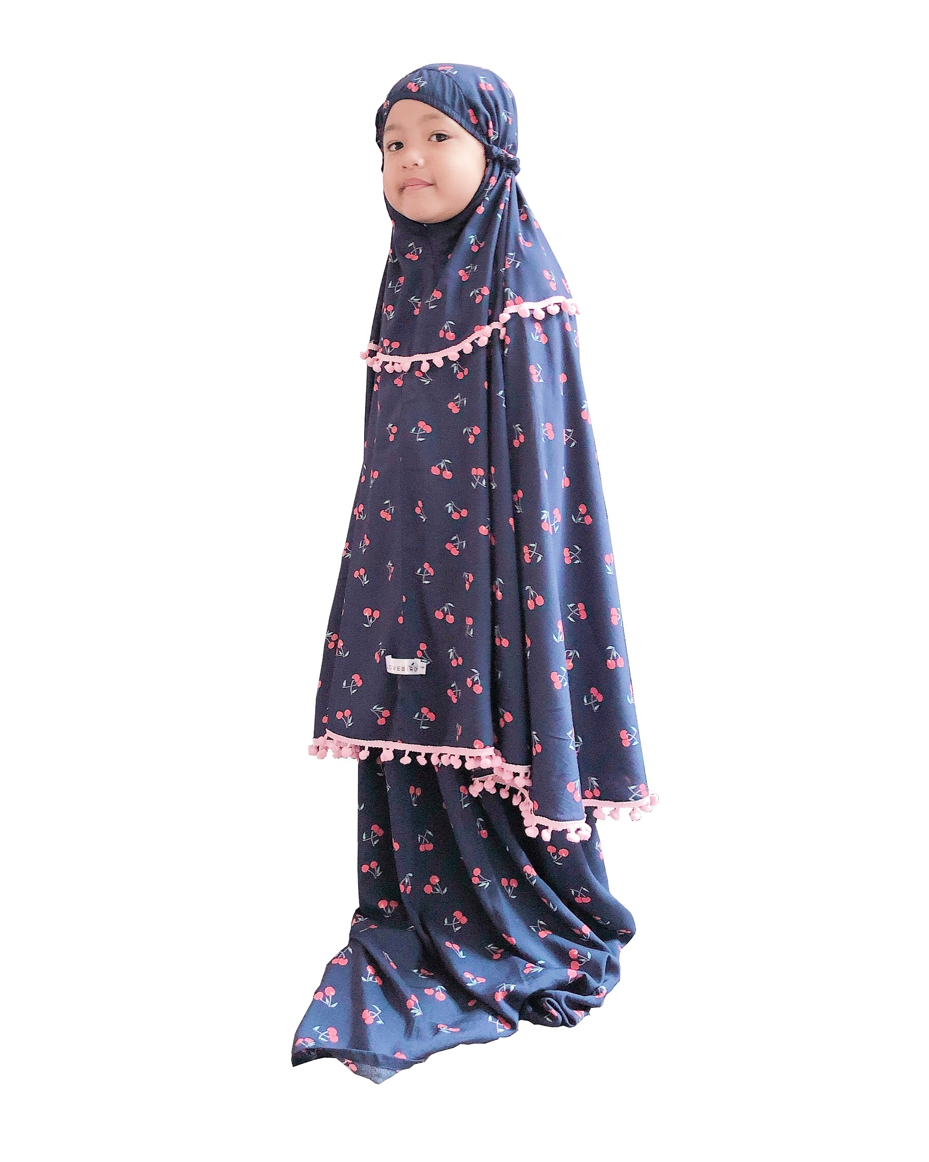Mukena anak berbahan katun sejuk dengan motif cherry berwarna dasar navy. Terdapat aksen pompom menggemaskan di sekelilingnya. Bahan yang membuat betah untuk dikenakan dan motifnya yang lucu membuat si kecil semakin bersemangat untuk belajar beribadah. Masih banyak lagi motif lainnya yang dapat dipilih sesuai warna kesukaan si kecil.