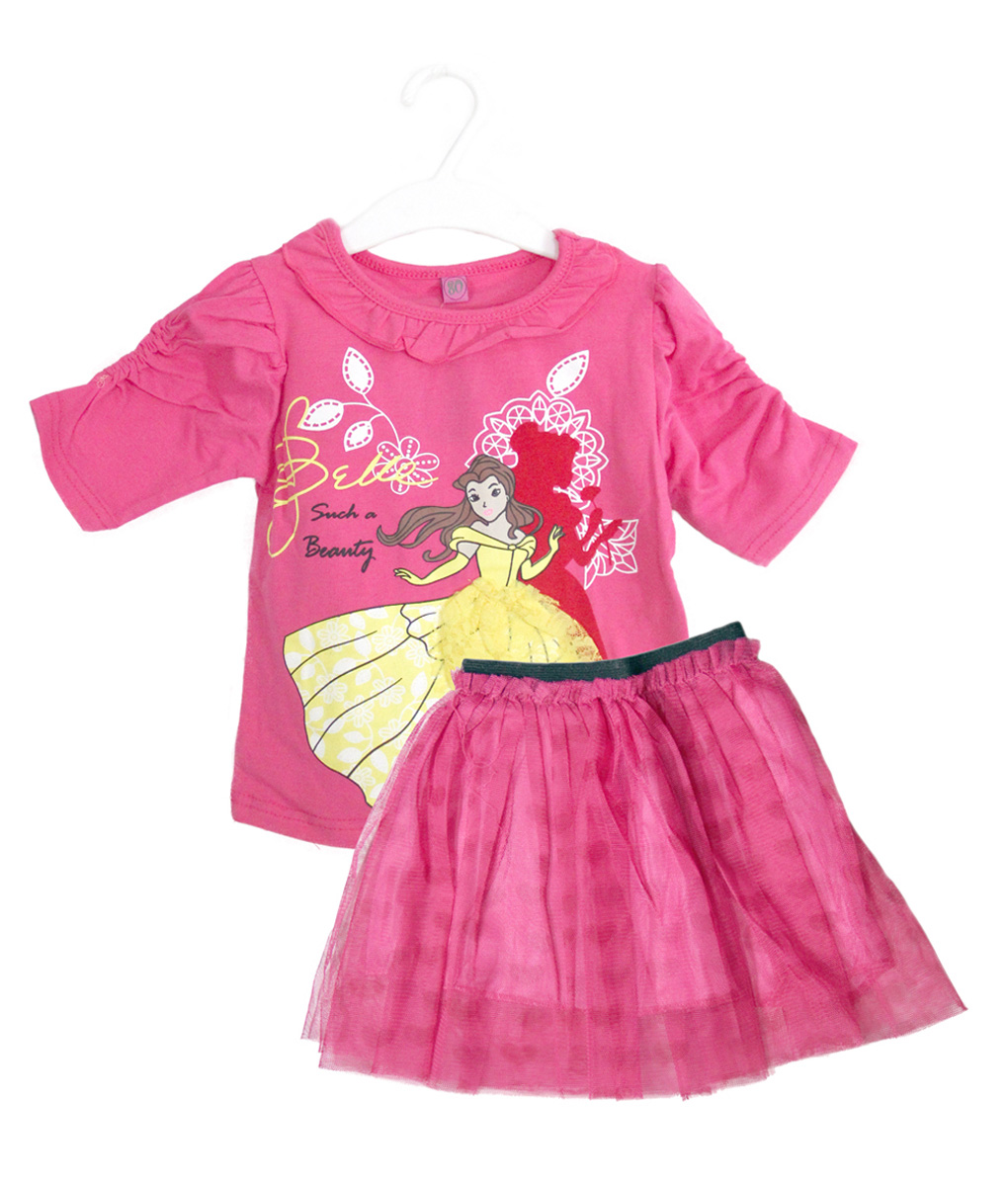 Setelan anak lengan tanggung, kaos warna pink gambar Princess Belle dengan aksen frill pada bagian kerah dan aksen kerut pada bagian lengan, rok pendek tutu warna pink. Standar cutting.