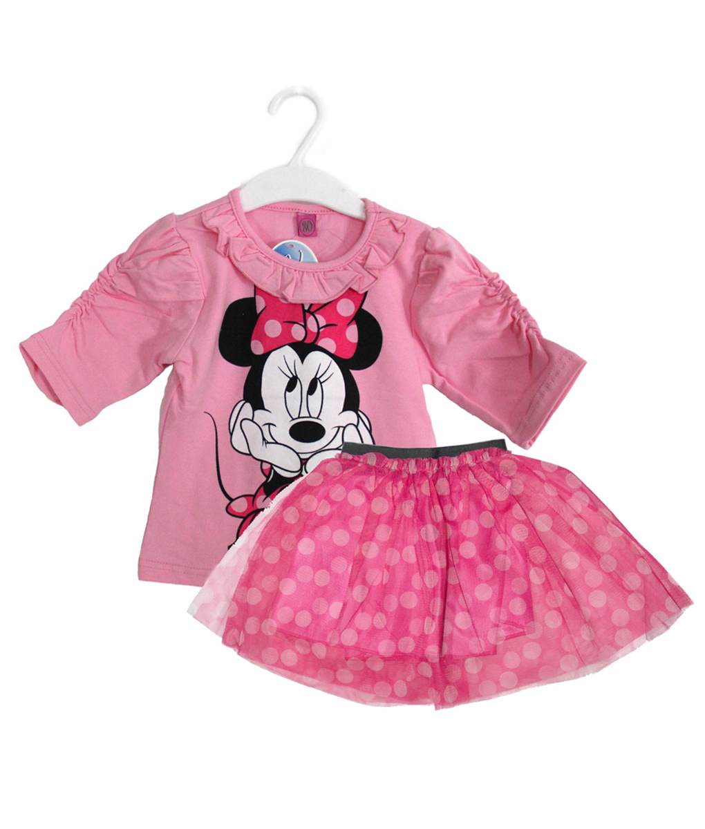 Setelan anak lengan tanggung, kaos warna abu-abu gambar Minnie dengan aksen frill pada bagian kerah dan aksen kerut pada bagian lengan, rok pendek tutu warna pink. Standar cutting.