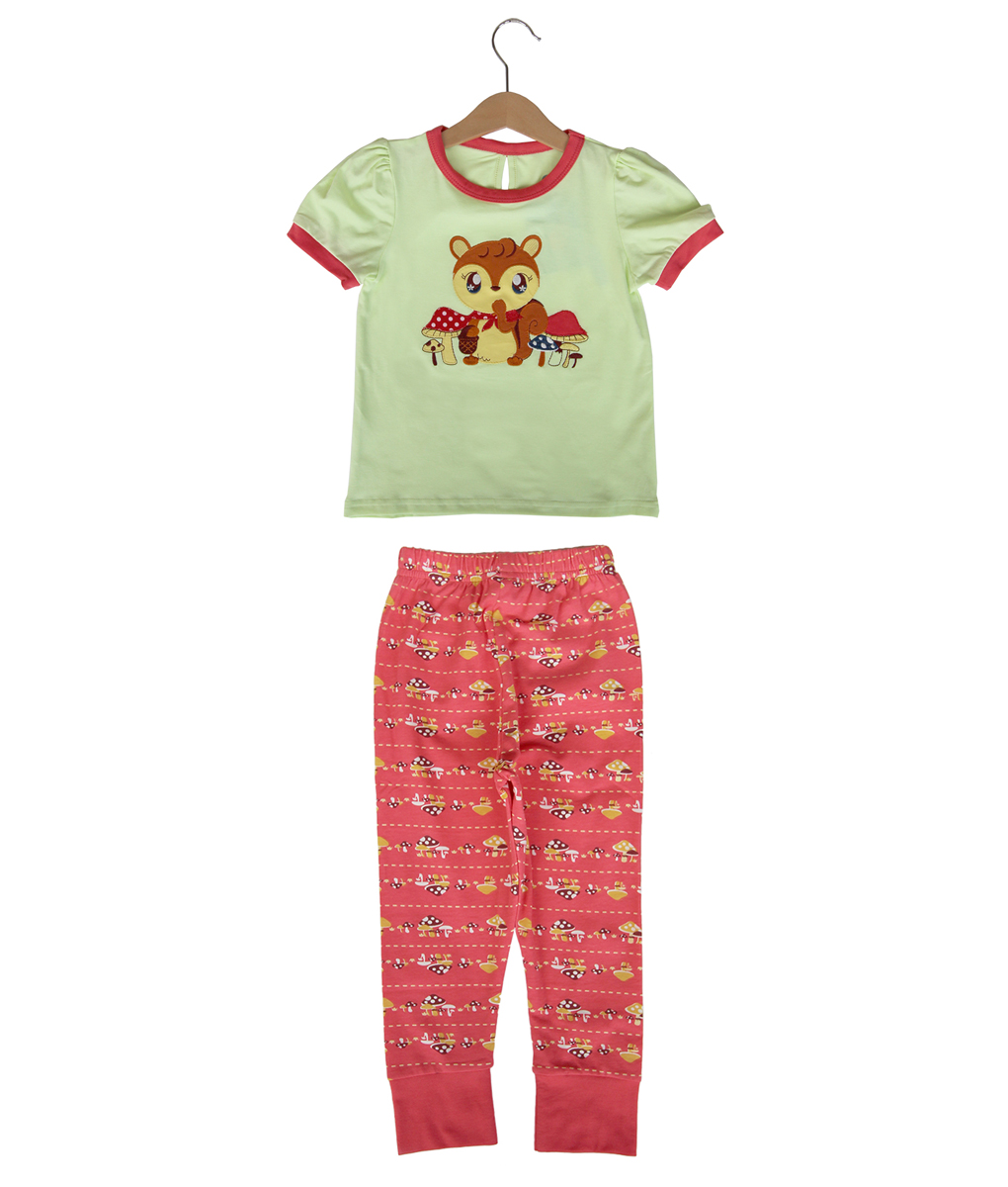 Piyama anak lengan pendek dengan aksen manset warna hijau dan pink, atasan gambar tupai, celana motif serasi. Standar cutting.