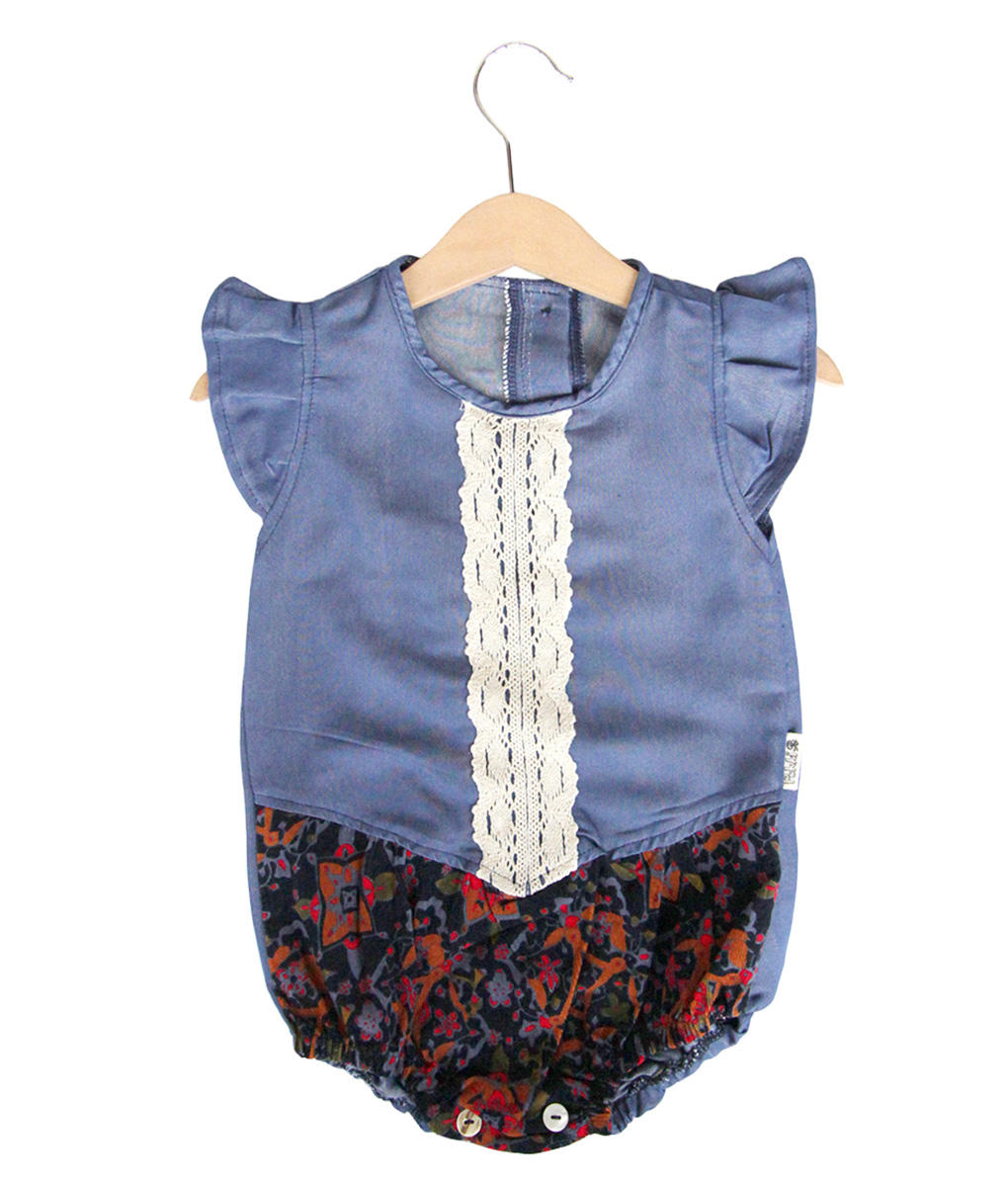 Romper bayi 0-1 tahun dengan bahan denim dipadu corduroy dengan motif yang cantik, tersedia dalam warna biru. Romper dengan motif bunga pada bagian bawah dan denim pada bagian atas, dengan aksen renda pada bagian tengahnya. Standard cutting.