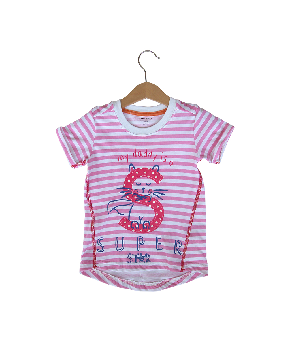 Kaos anak lengan pendek yang nyaman untuk dipakai di rumah dan tetap keren untuk dipakai beraktivitas di luar rumah, warna putih garis-garis pink dengan gambar huruf S motif polkadot. Standar cutting.