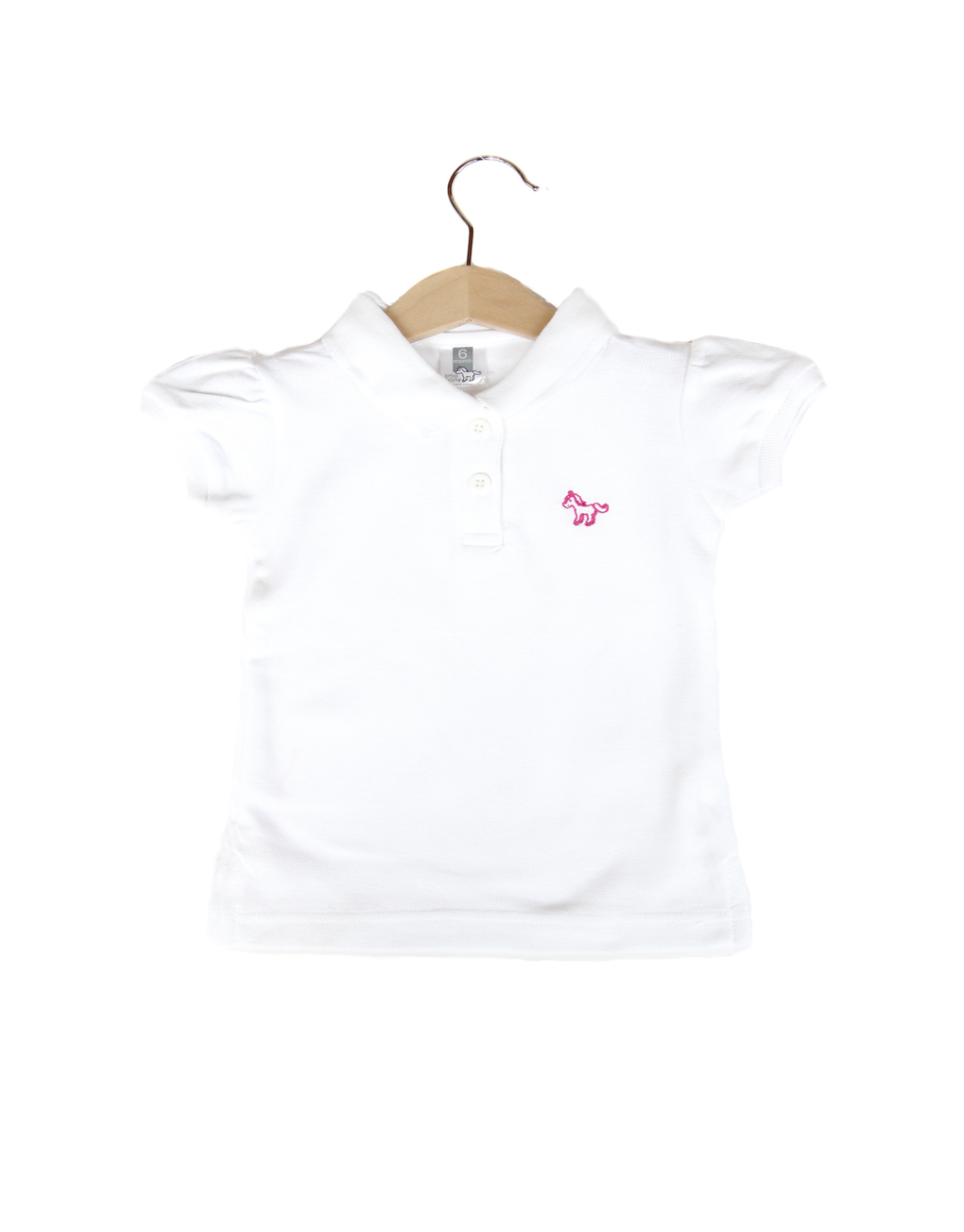 Kaos kerah bayi dan anak warna putih potongan girl dengan dua kancing dada dan bordir kuda poni. Standard cutting.