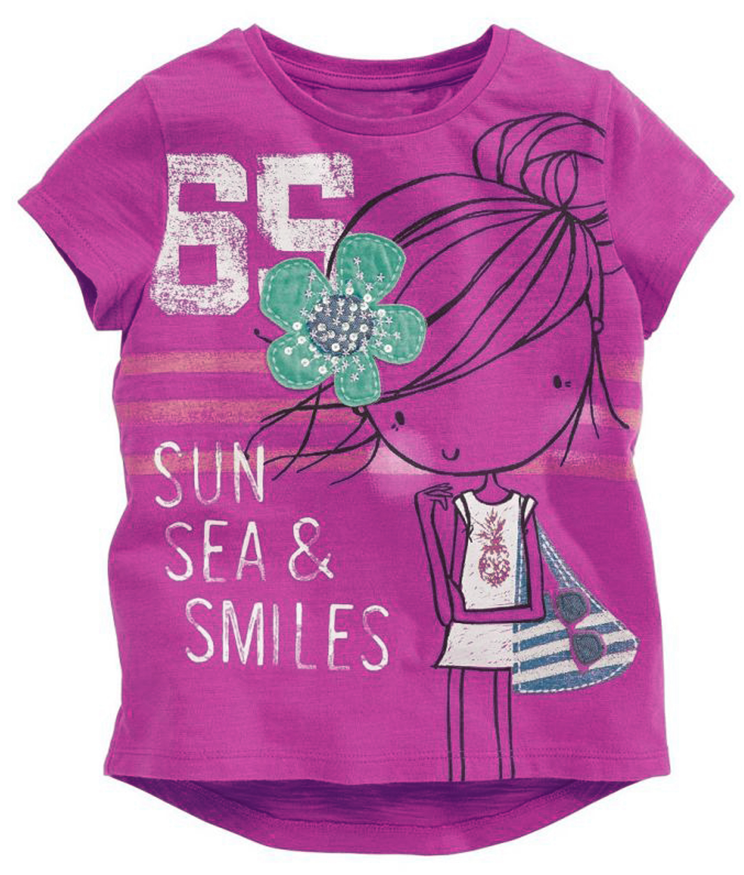 Kaos anak dengan bahan cotton yang nyaman untuk bermain di rumah dan tetap stylish untuk bepergian, warna pink dengan gambar ilustrasi anak perempuan yang akan pergi ke pantai, lengkap dengan tas pantai dan hiasan bunga besar di kepala. Standard cutting.