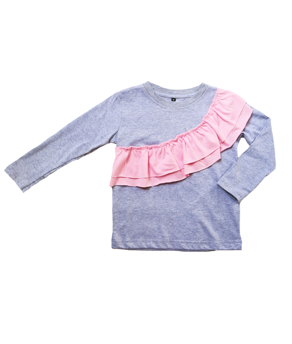 Kaos lengan panjang untuk anak perempuan usia 2-9 tahun berwarna abu-abu, terdapat aksen ruffle pada bagian pundak sampai dada dengan warna pink. Standar cutting.