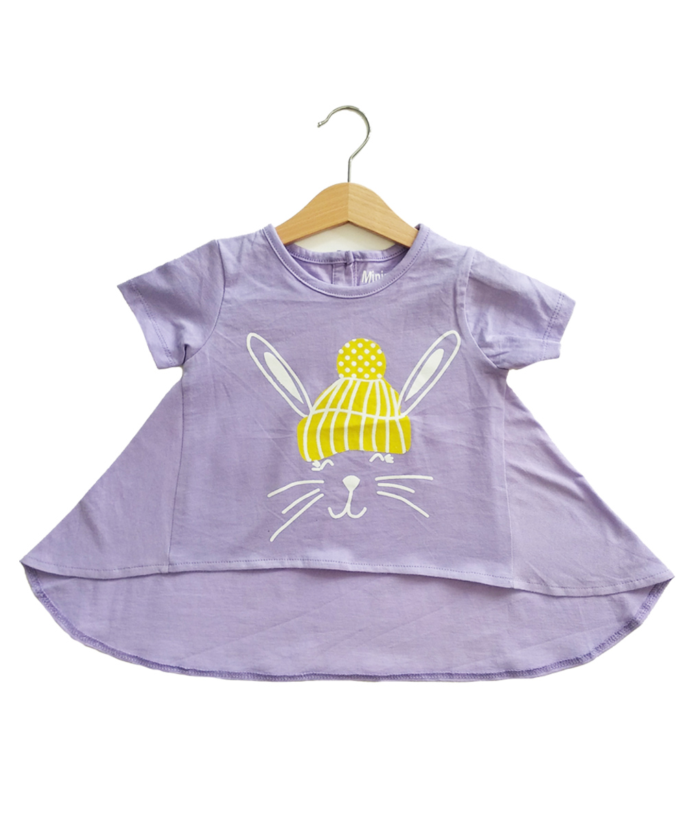 Kaos dengan desain potongan A line untuk si cantik usia 2-5 tahun. Warna ungu dengan gambar wajah kelinci yang lucu. Pas dikenakan untuk kegiatan harian si kecil. Standar cutting.
