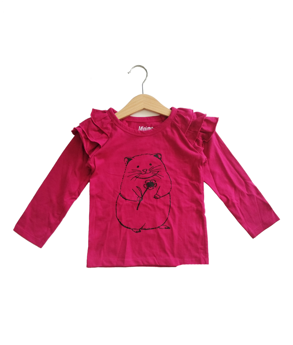 Kaos lengan panjang berwarna hot pink dengan sablon berbentuk karakter binatang yang lucu. Terdapat aksen ruffle pada bagian pundaknya sehingga terlihat manis. Bahannya nyaman dikenakan untuk aktivitas sehari-hari. Fit cutting. Upsize jika si kecil terbilang besar.