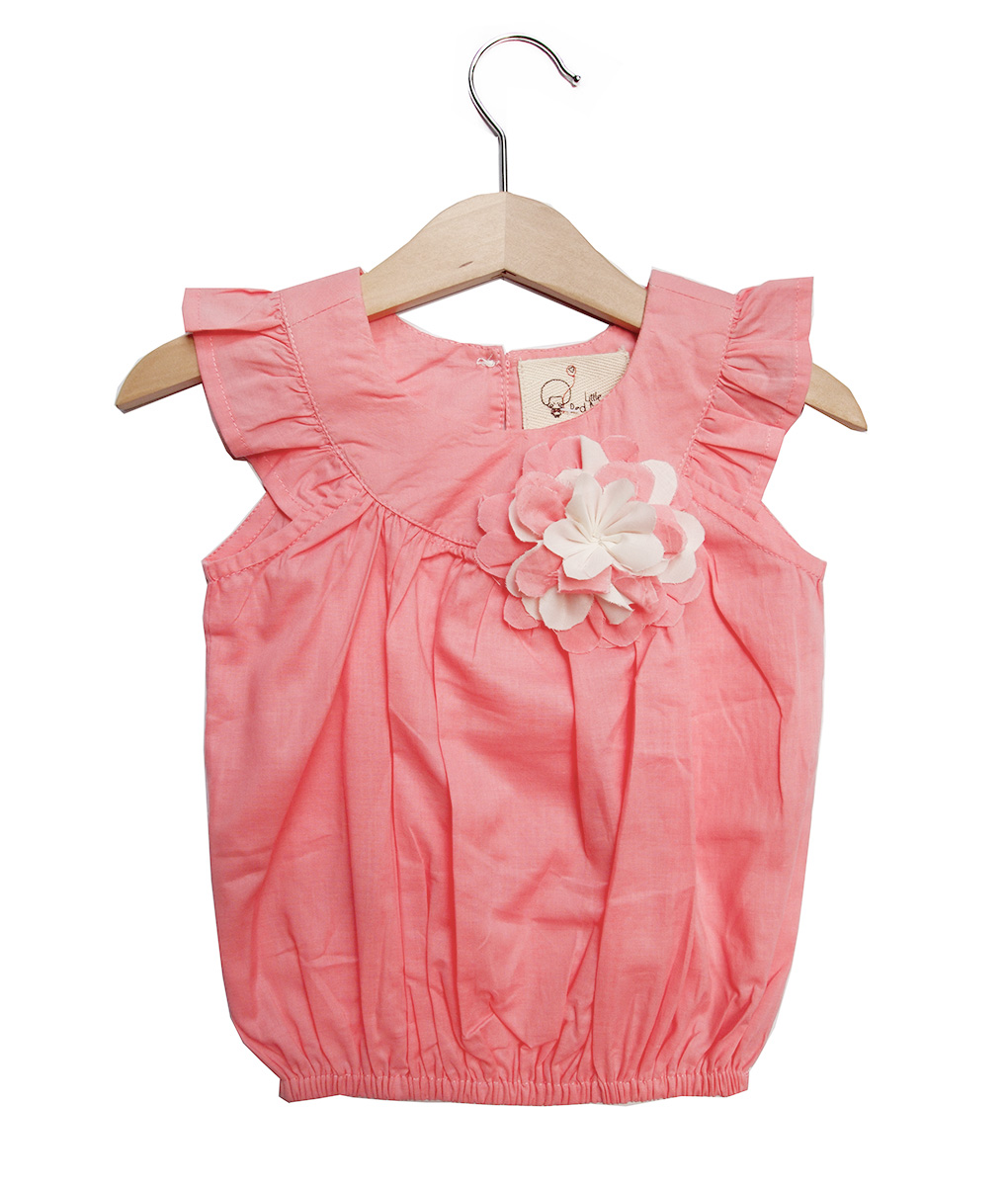 Atasan anak peremuan warna pink dengan lengan aksen cut-out dengan frill, dilengkapi hiasan korsase dua warna, dengan karet di bagian bawah baju untuk membentuk garis pinggang menggembung. Standard cutting.
