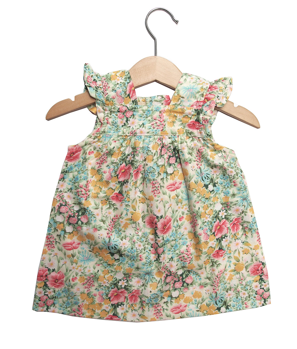Dress pendek atau atasan babydoll anak motif bunga dan dedaunan berbagai warna yang manis, lengan cut-out dengan aksen frill, bentuk kerah trapesium bagian bawah A-Line. Standard cutting.