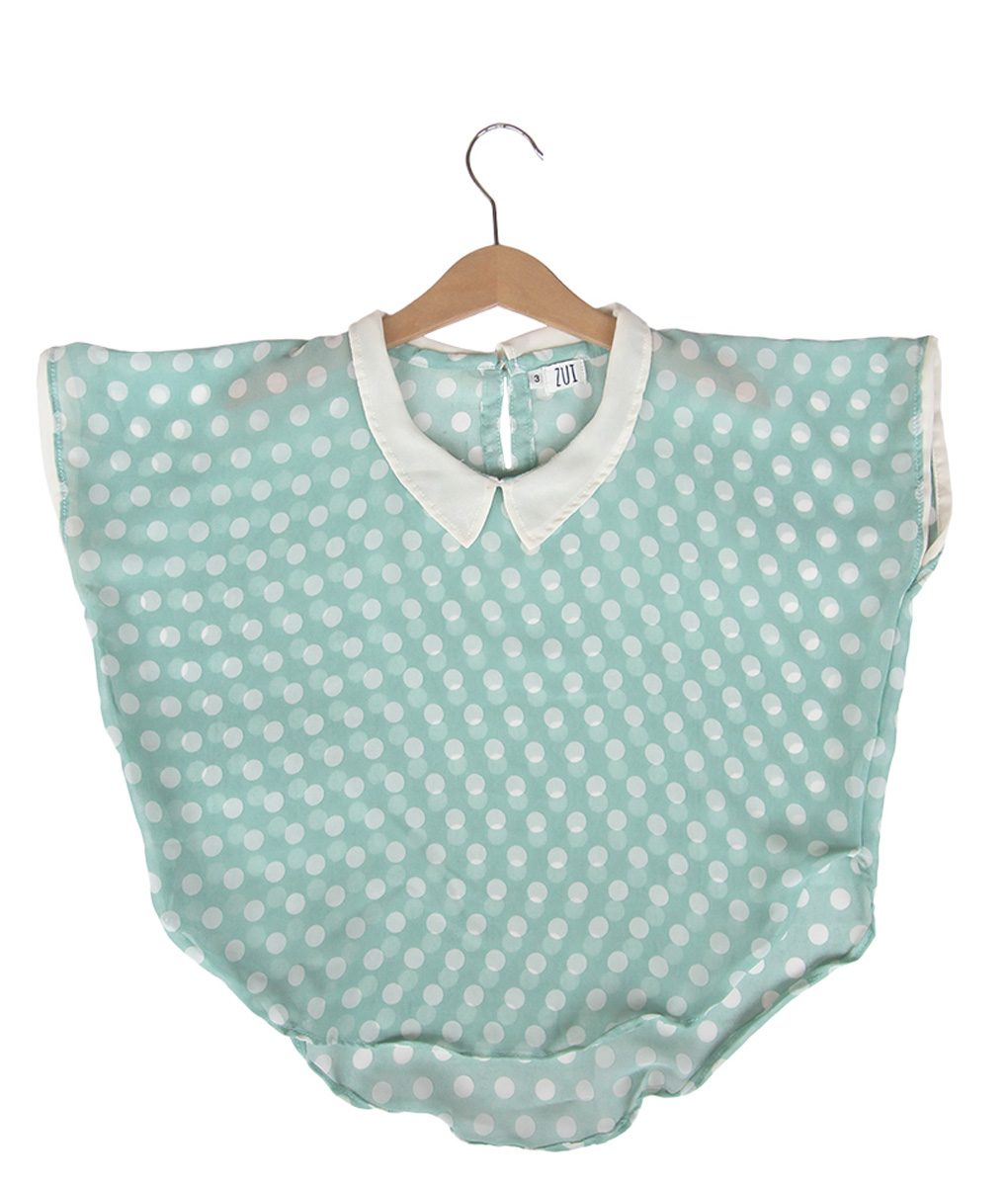 Kaftan anak lengan batwing, model longgar dengan kerah pointed flat putih, warna toska motif polkadot, manis untuk dipadukan dengan legging atau celana skinny. Standar cutting.